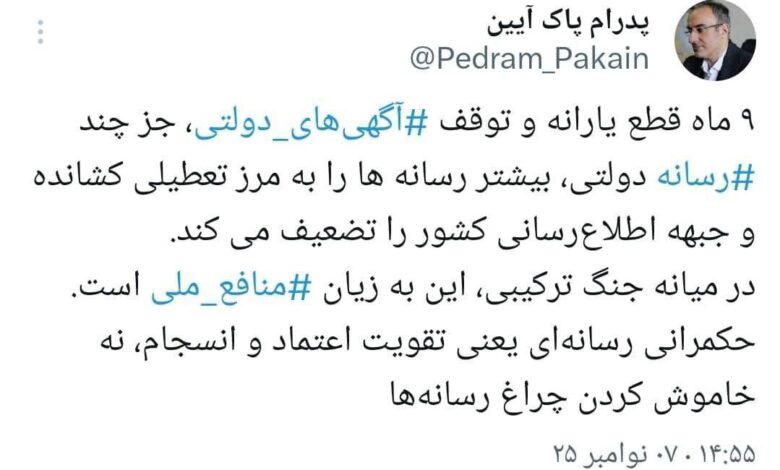✍️پدرام پاکآیین، نماینده مدیران مسئول رسانهها در شبکه ایکس نوشت: