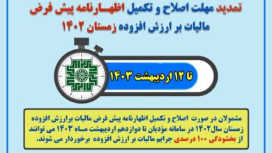مهلت اصلاح و تکمیل اظهارنامه پیش فرض مالیات بر ارزش افزوده زمستان 1402 تا 12 اردیبهشت ماه 1403 تمدید شد.